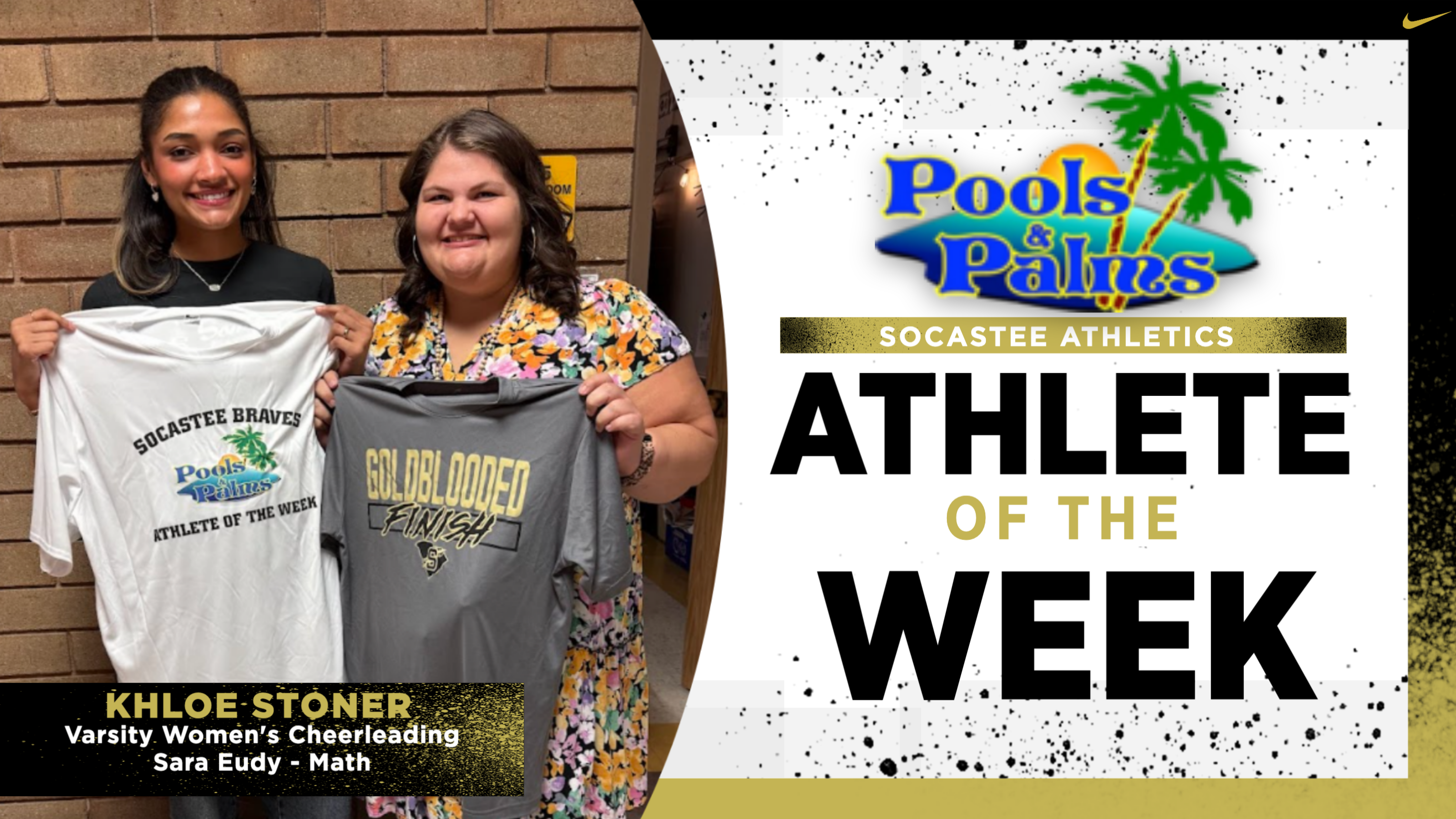 Pools and Palms Week 18 Athlete of the Week is Khloe Stoner, Varsity Cheer. Khloe has shown tremendous perseverance in returning from an injury that forced her to miss most of the football season. During this basketball season, she has demonstrated dedication and drive by supporting her teammates and continually pushing herself to improve in her role as a back spot. Khloe has chosen to recognize Miss Eudy her former Algebra 2 teacher. Khloe states that Miss Eudy has always believed in her, and has always made her feel good about herself. She is a positive influence on Khloe.