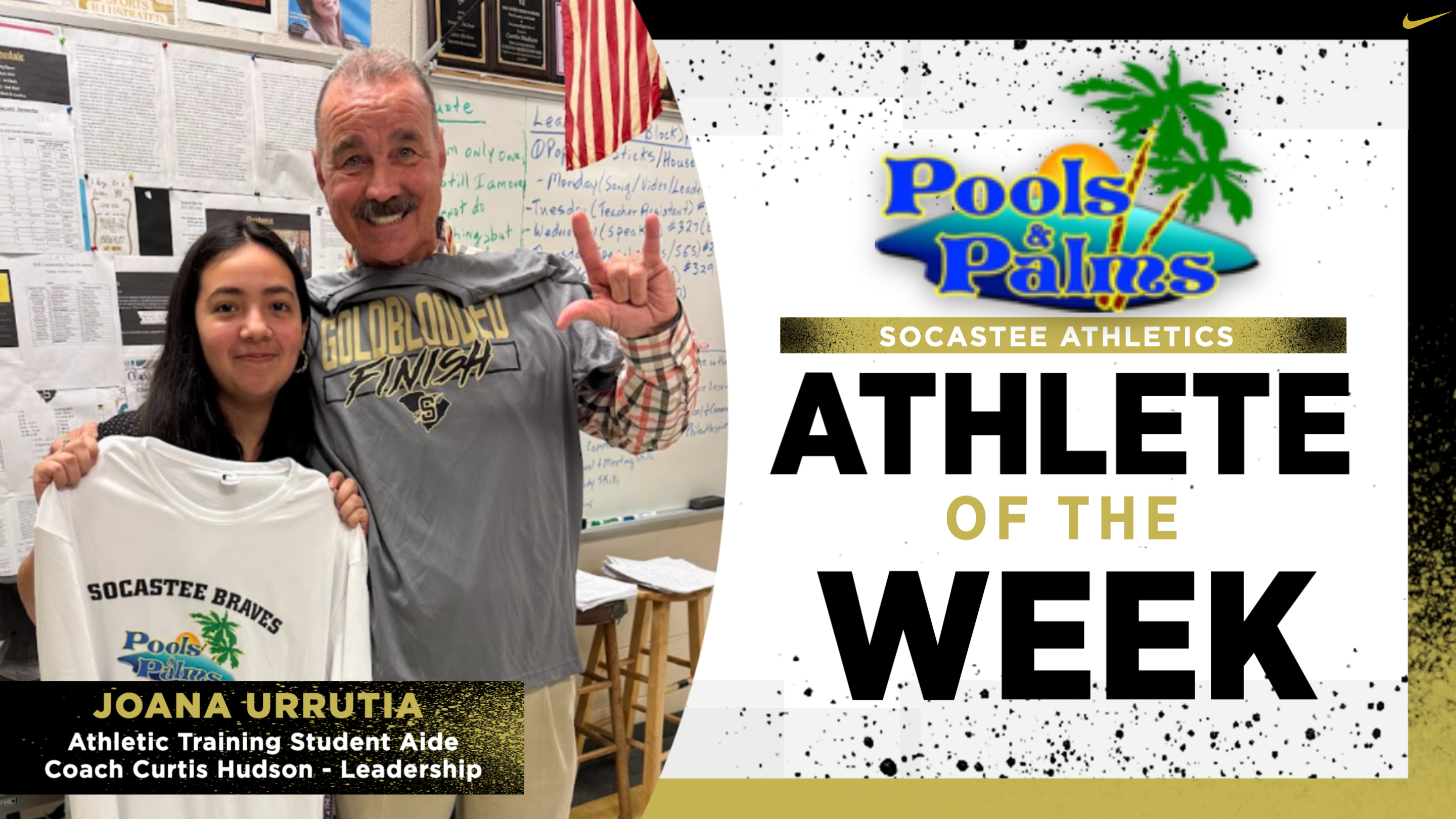 Week 24 Pools and Palms Athlete of the Week is Joanna Urritia, athletic trainer. Joanna has been a dependable student trainer for several years. She is personable and a terrific worker and young lady. Joanna has been an awesome part of the training staff. Joanna chose to recognize Coach Curtis Hudson. She remarked how positive Coach Hudson is and that he always is supportive of all students here at SHS and at the elementary schools he visits. His attitude is contagious and he can make anyone’s day be a great day.