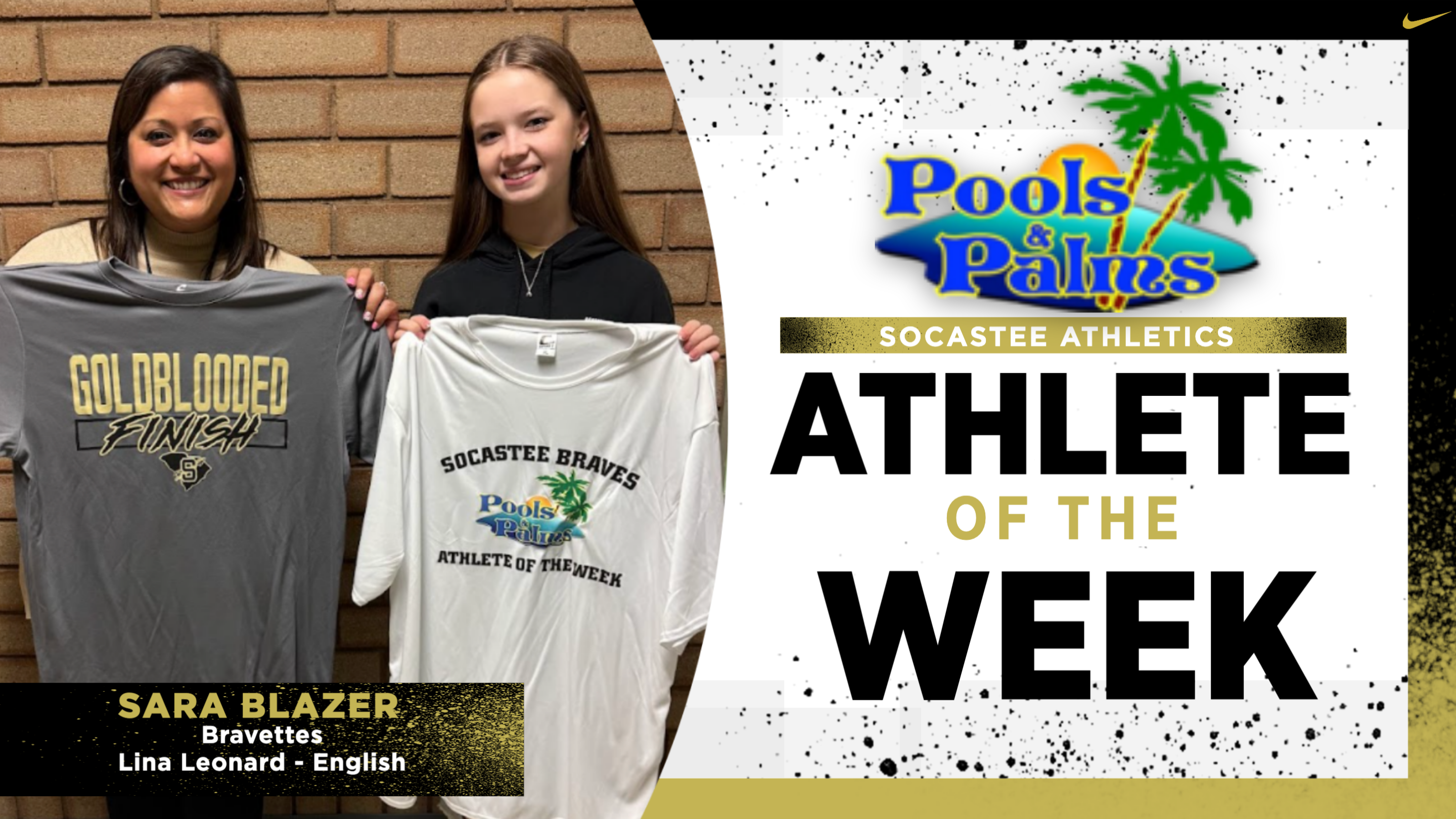 Pools and Palms Week 20 Athlete of the Week is Sara Blazer, from the Bravettes. Sara has been a terrific dancer for the Bravettes throughout the Fall and Winter season. Sara has chosen to recognize her English 3 Honors and AP Language teacher Mrs. Leonard. She says Mrs. Leonard is always there to help her and provide encouragement to all facets of life. Congratulations to Sara and Mrs. Leonard.