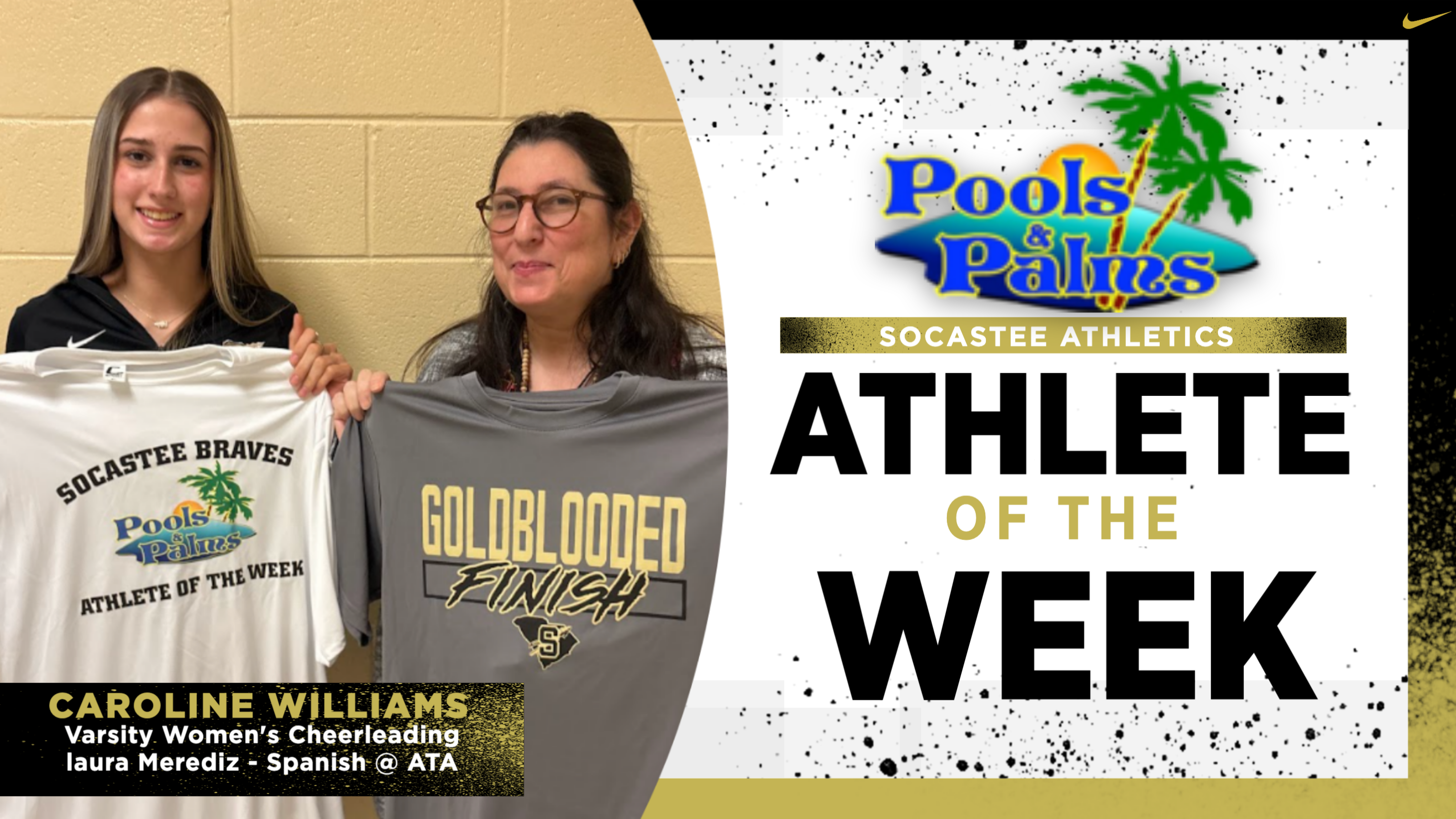 Pools and Palms Week 22 Athlete of the Week is Caroline Williams, Varsoty Cheer..Caroline has shown outstanding dedication to improving her all-around cheerleading skills. From putting in extra time to sharpen her tumbling to being a loud, energetic presence on the sidelines calling cheers, she consistently leads by example. Caroline is always encouraging her teammates and never hesitates to put in the extra work to help make the team better. She is a tremendous asset to our program, and we can’t wait to see what the future holds for her.Caroline chose to honor her Spanish teacher at ATA, Ms. Laura Merediz Congrats Caroline and Ms. Merediz!