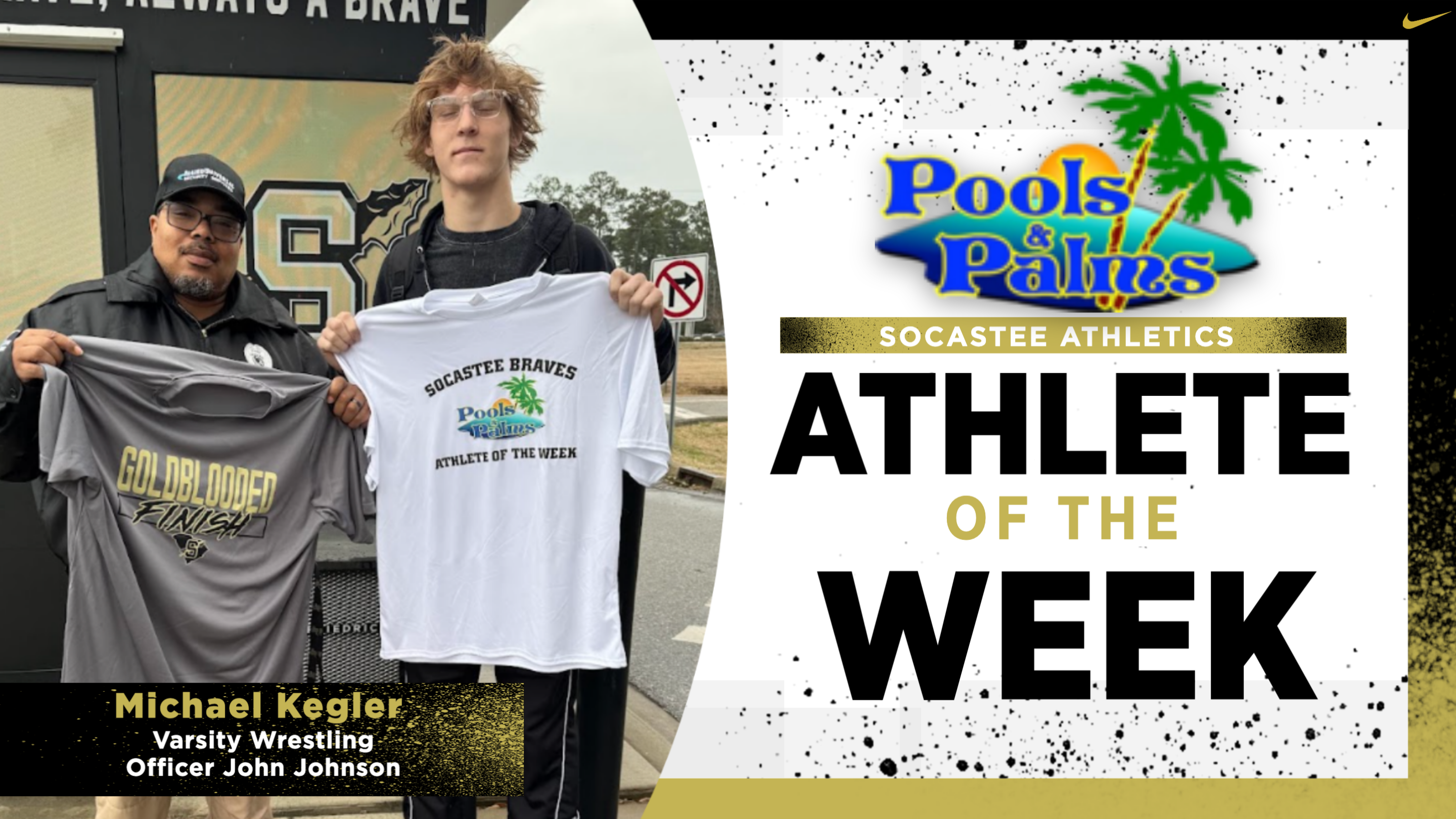 Pools and Palms Week 21 Athlete of the Week is Michael Kegler, Varsity Wrestling. The record of 144 Varsity Wrestling wins that has been held for 12 years has been broken. That record now belongs to Senior Michael Kegler. After tonight, Michael now stands at 147 wins and counting. He will have a chance to continue setting a new high as team playoffs are set to begin this weekend. Michael has chosen to recognize staff member, Officer John Johnson. Michael says everyday he comes to school, Officer Johnson asks about wrestling and has taken interest in how he is performing. He has been a daily supporter. Congrats Michael and Officer Johnson.